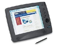 WebPAD Forget PC's, this device and similar technologies, could revolutionize the way we interact with the Web. One of the brightest buzzes at Comdex/Fall '98, the Cyrix WebPAD allows affordable, wireless access to the Net. Just like your portable phone, a WebPAD (or WebPADs!) "talks" to a receiving station that is connected to the Net via a variety of methods (phone, ISDN, xDSL, etc.). And, just like your portable phone, you'll be able to roam around the house, in the garden, wherever is in range of the base station, and interact with the Web. In fact, you should be even able to use it as a phone! Developed by the Cyrix Conceptual Products Group, the WebPAD weighs in at less than 3lbs (1.5Kg), has built-in speakers and microphone, 2 USB ports, and should be available in the next 6 months. See the Cyrix Press Release for further details or for more information, click here.